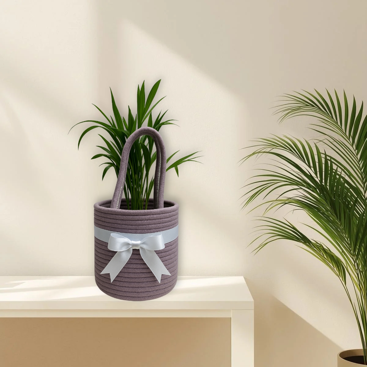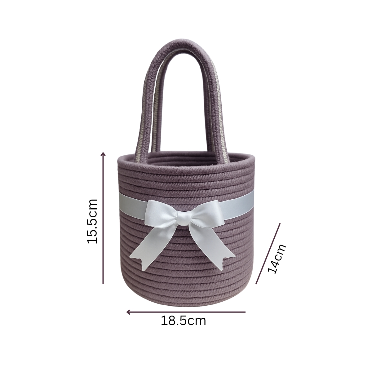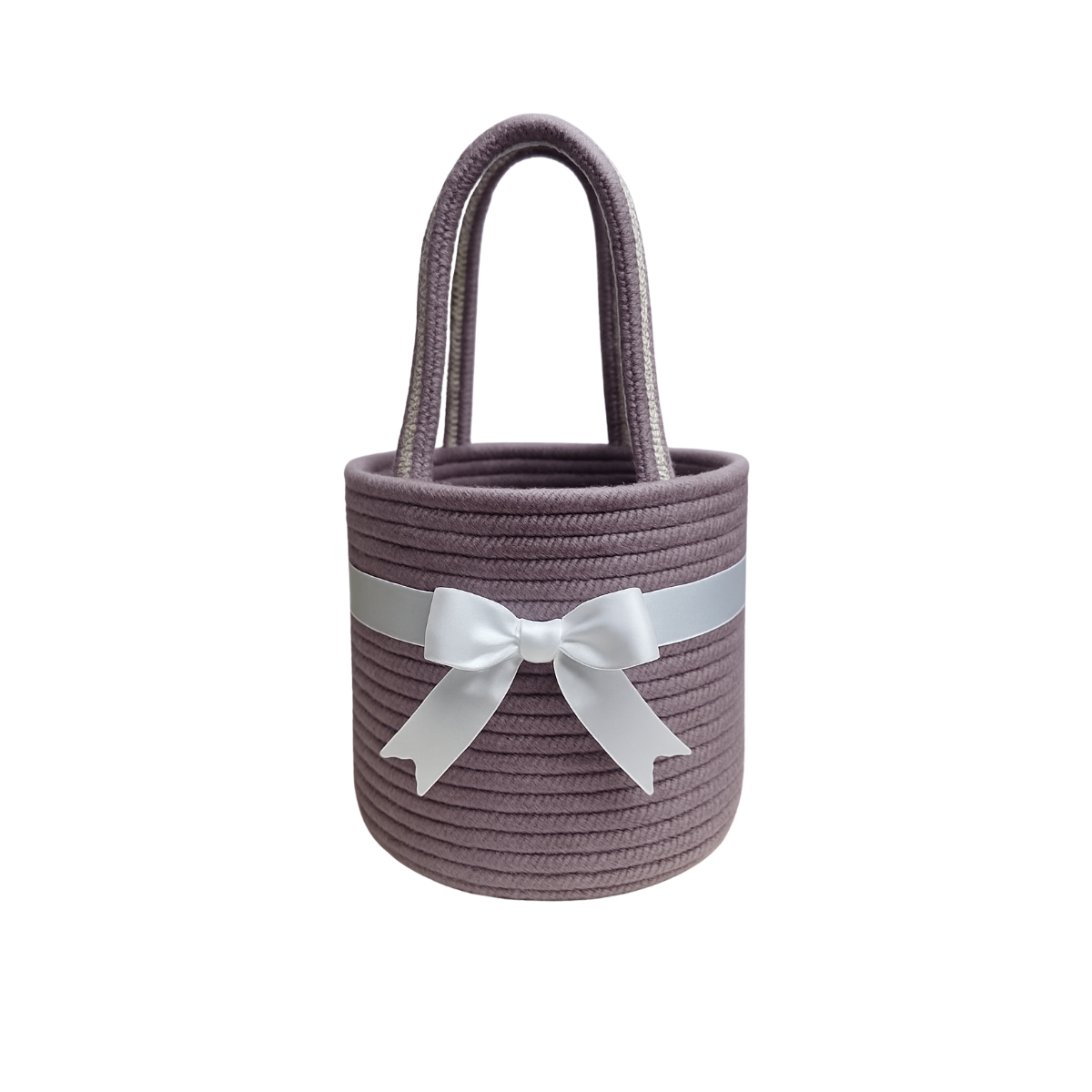 Made from 100% cotton rope and adorned with a soft white satin bow, this handcrafted basket adds a subtle touch of luxury to your home or workspace.